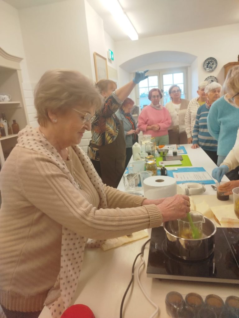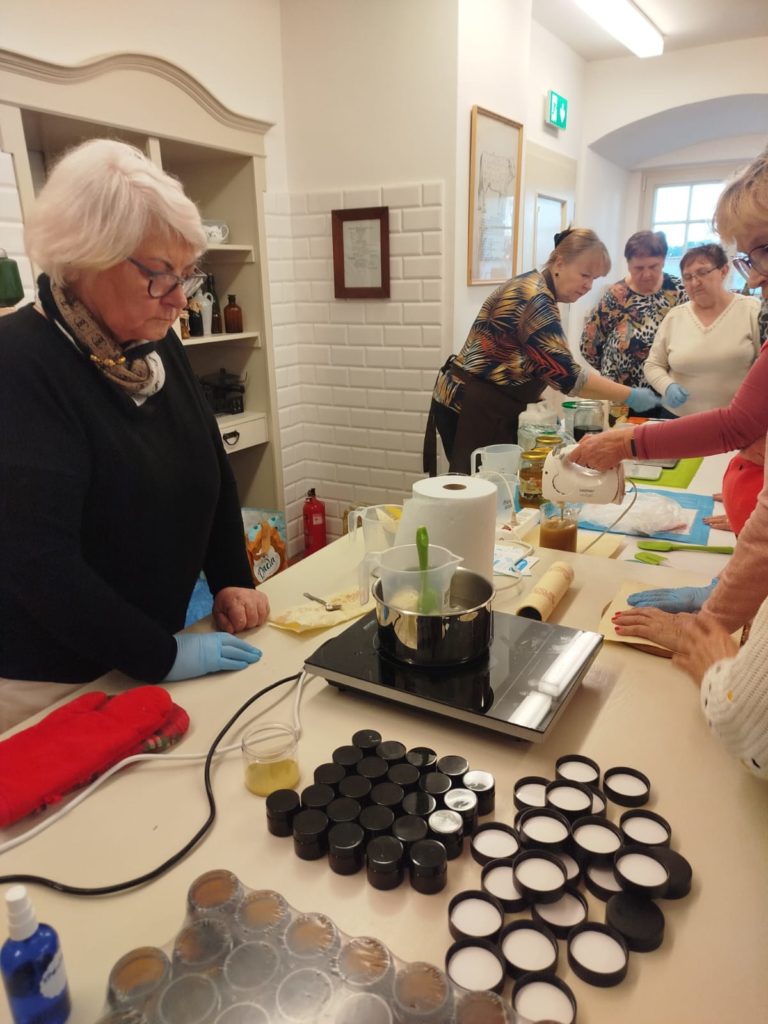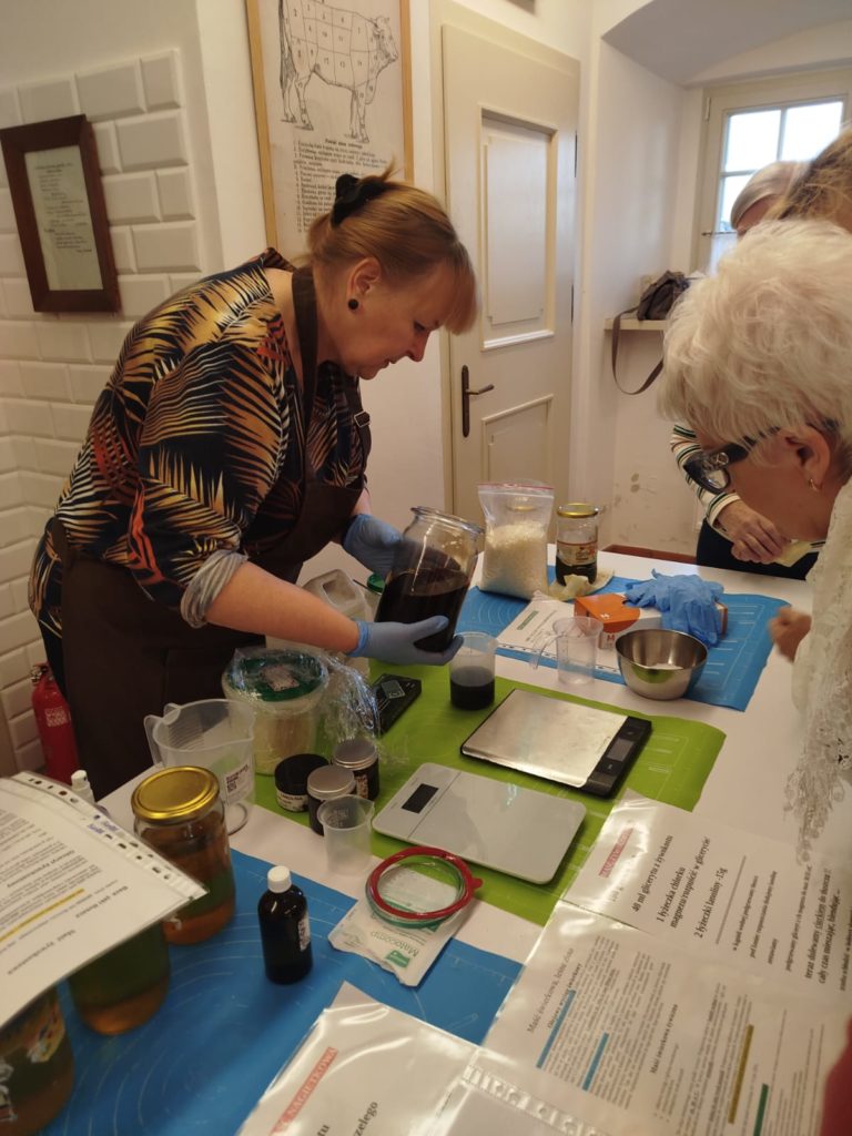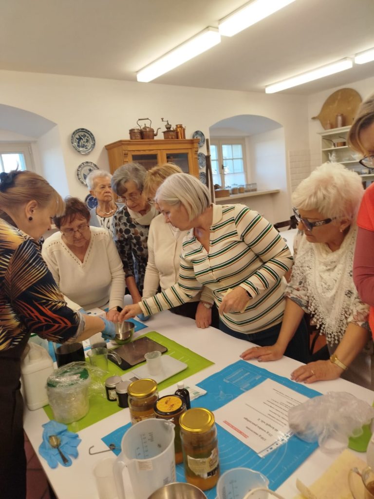 Tematem były „maści wszelakie”, wśród nich nagietkowa, żywokostowa oraz świerkowa. Przy aromatycznej świerkowej herbatce wysłuchałyśmy opowieści o znaczeniu ziół i możliwościach ich wykorzystania.